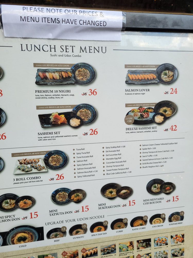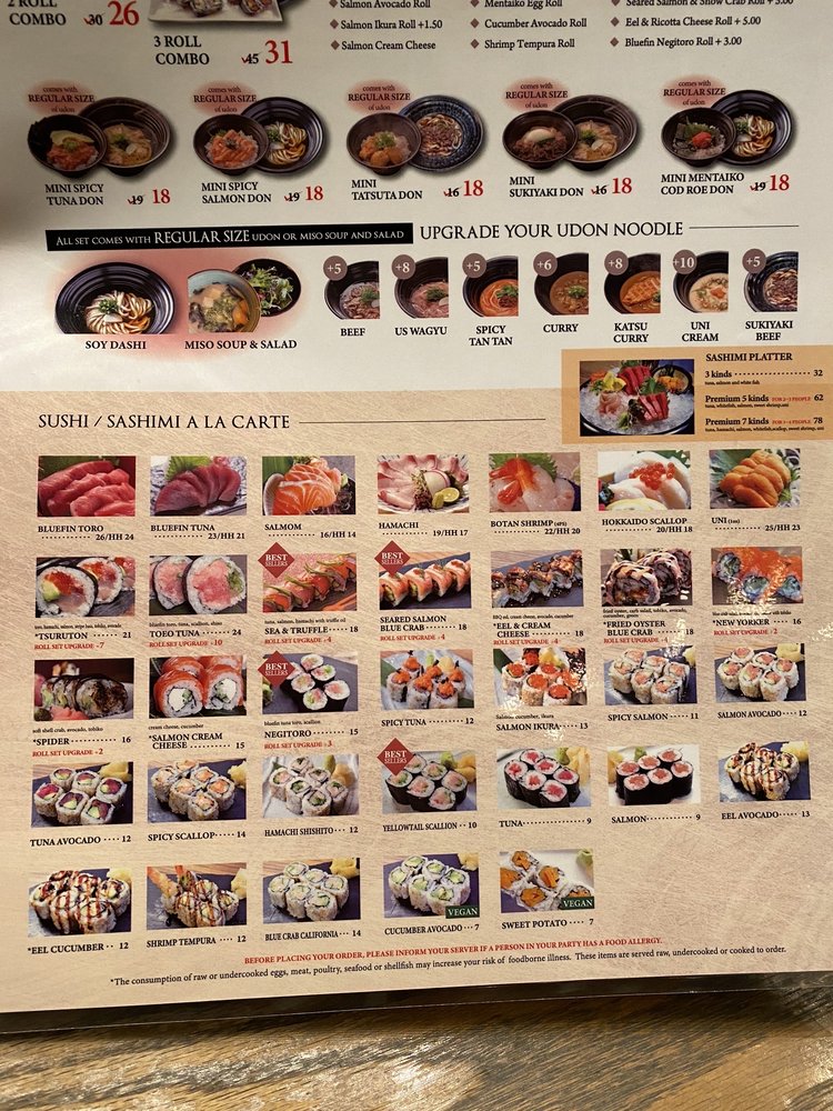 ** It does NOT include UDON ** Bluefin Tuna, Bluefin Toro, Salmon, Kanpachi Hamachi, Spicy Tuna, Tobiko, Unagi and Tuna roll